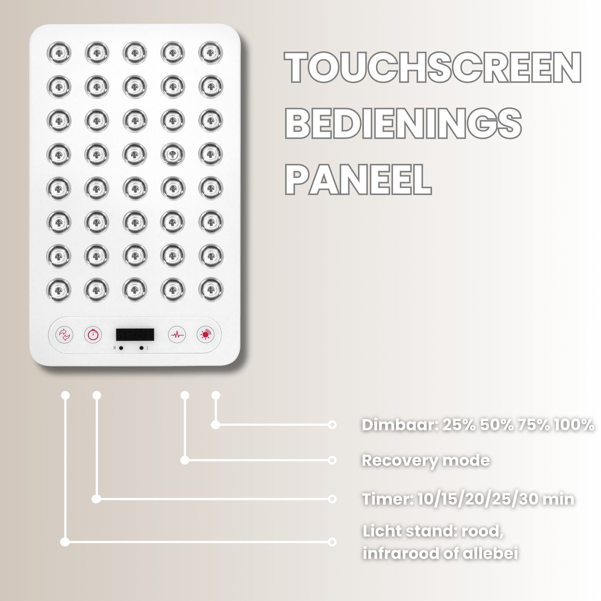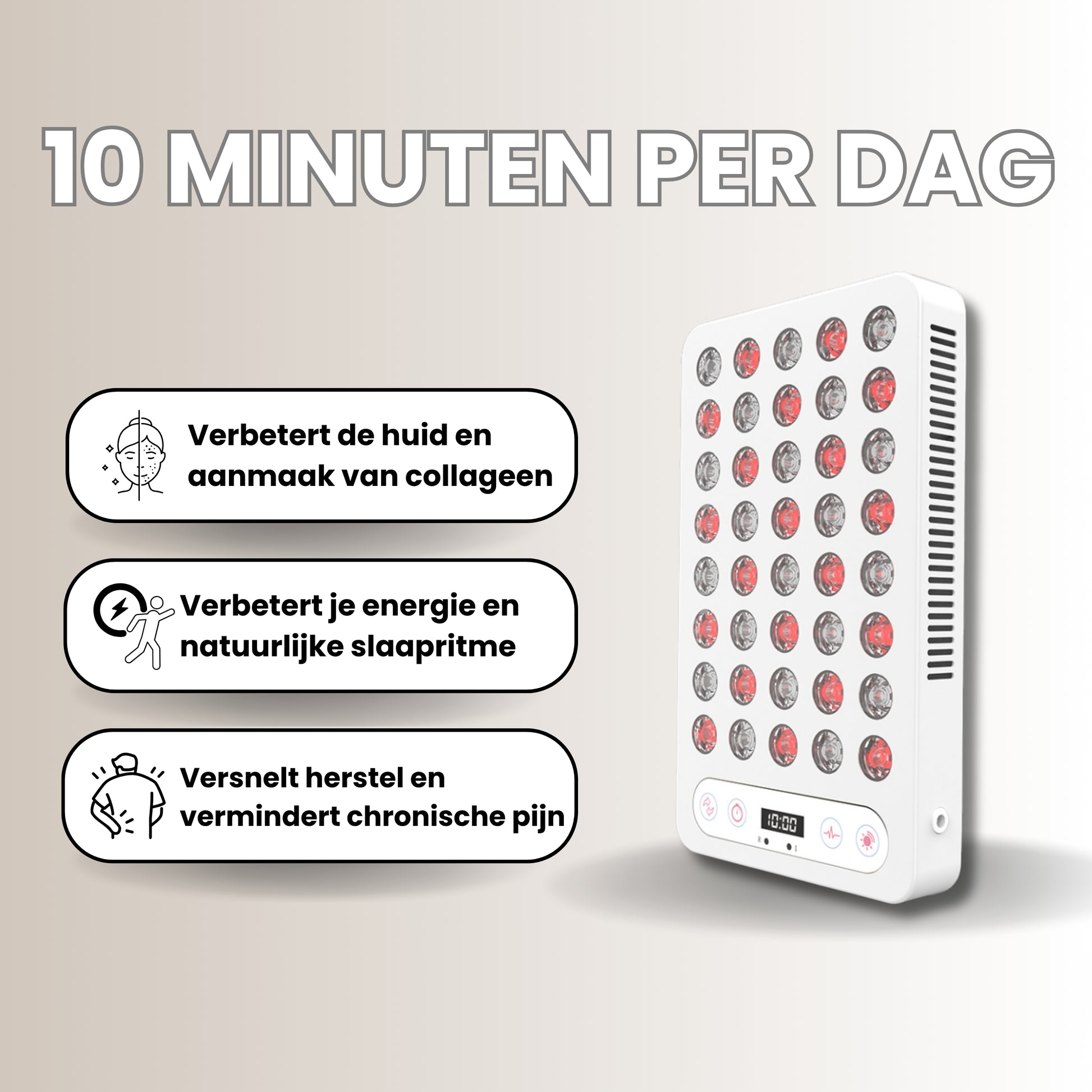 Dit hangt af van het paneel en het doel. Voor huidverbetering zijn sessies van 5 tot 10 minuten (3 tot 7 keer per week) op een afstand van 15-30 cm gebruikelijk. Voor diep weefsel/spierherstel kunnen de sessies langer duren, maar de aanbevolen behandeltijd is doorgaans tussen de 10 en 15 minuten. Het LED Masker gebruik je 10 minuten per dag, 3 tot 7 keer per week.