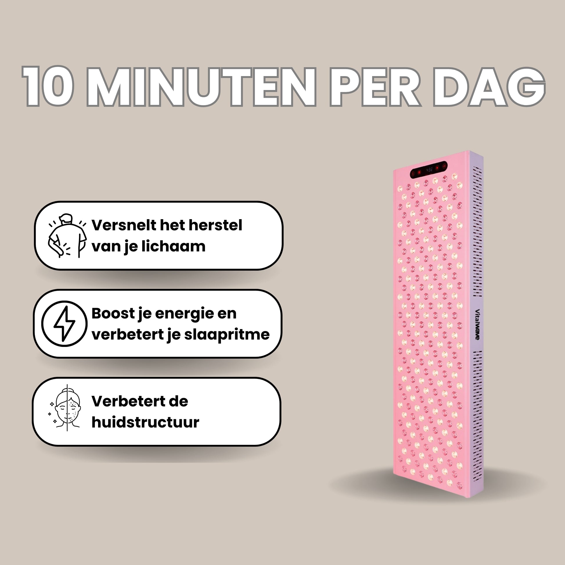 De Vitalwave VT1200 is een krachtig medical grade rood licht therapie paneel die geschikt is voor behandelingen van het halve lichaam. Met 224 x 5W LED’s op 660 nm en 850 nm ondersteunt deze lamp zowel huidverbetering als diepgaand spier- en weefselherstel. Dankzij de officiële MDR 2017/745-certificering profiteer je van bewezen effectiviteit, veiligheid en kwaliteit – eenvoudig inzetbaar in je eigen huis.