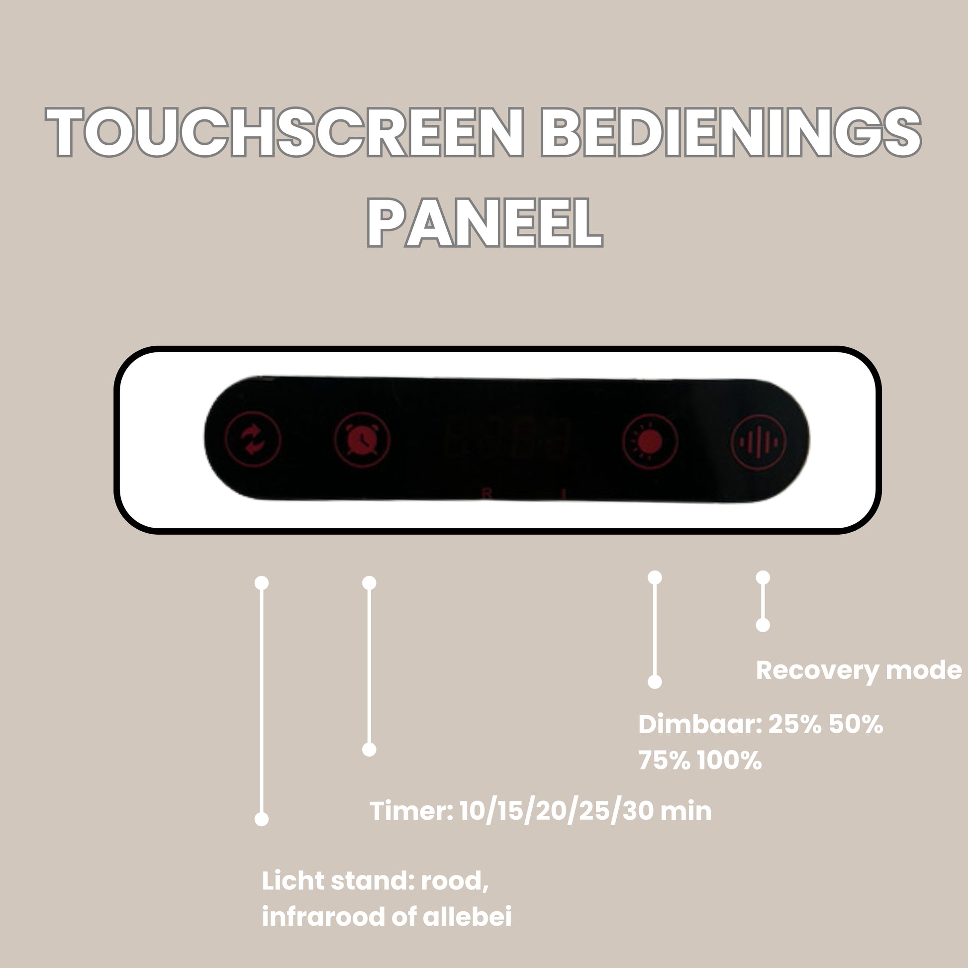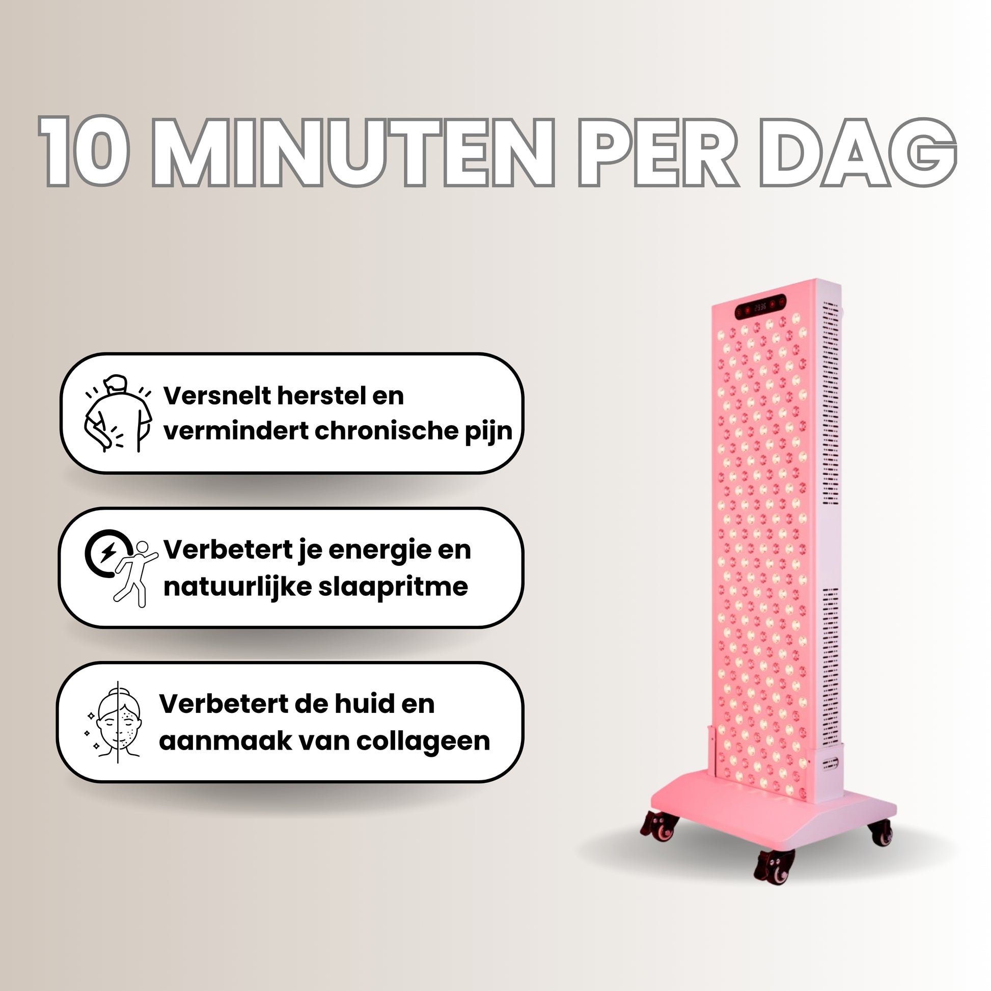 Dit hangt af van het paneel en het doel. Voor huidverbetering zijn sessies van 5 tot 10 minuten (3 tot 7 keer per week) op een afstand van 15-30 cm gebruikelijk. Voor diep weefsel/spierherstel kunnen de sessies langer duren, maar de aanbevolen behandeltijd is doorgaans tussen de 10 en 15 minuten. Het LED Masker gebruik je 10 minuten per dag, 3 tot 7 keer per week.