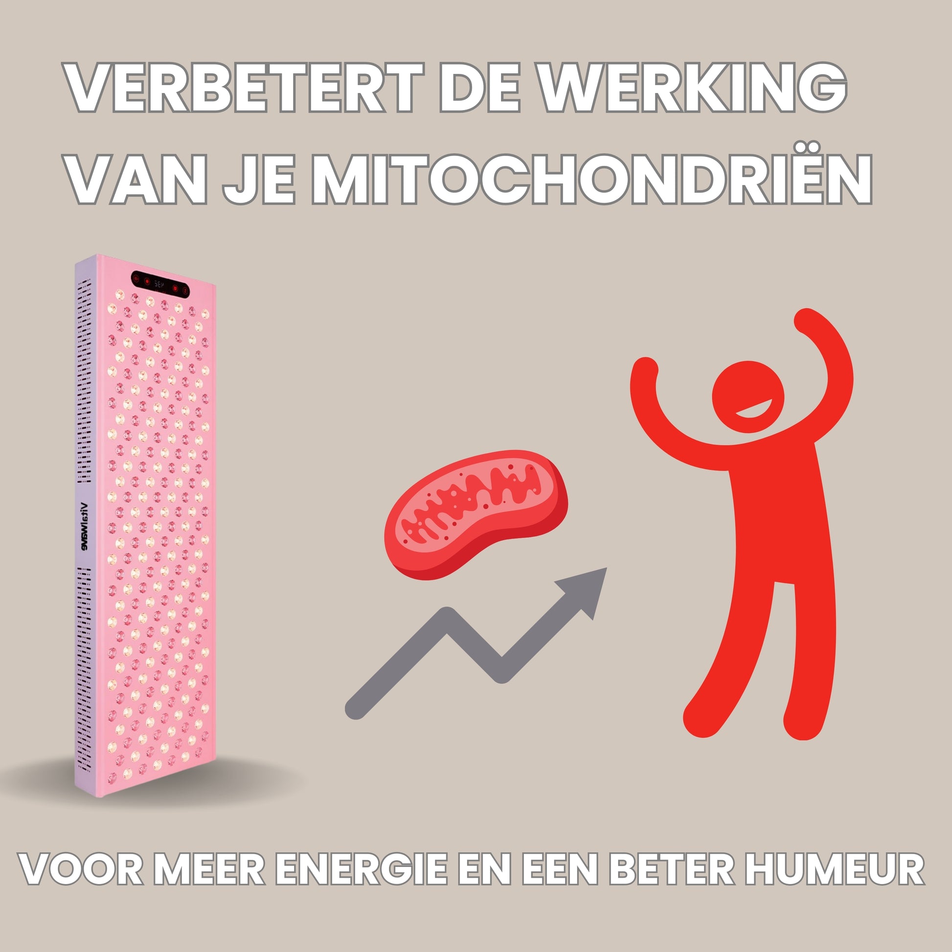 De Vitalwave VT1200 straalt krachtig rood en infrarood licht uit dat diep in de huid doordringt, de mitochondriën stimuleert en de productie van adenosinetrifosfaat (ATP) verhoogt. Dit versterkt de celregeneratie en verbetert de algehele celgezondheid. Hierdoor zijn jouw cellen beter in staat te functioneren wat zorgt voor tal van gezondheidsvoordelen.