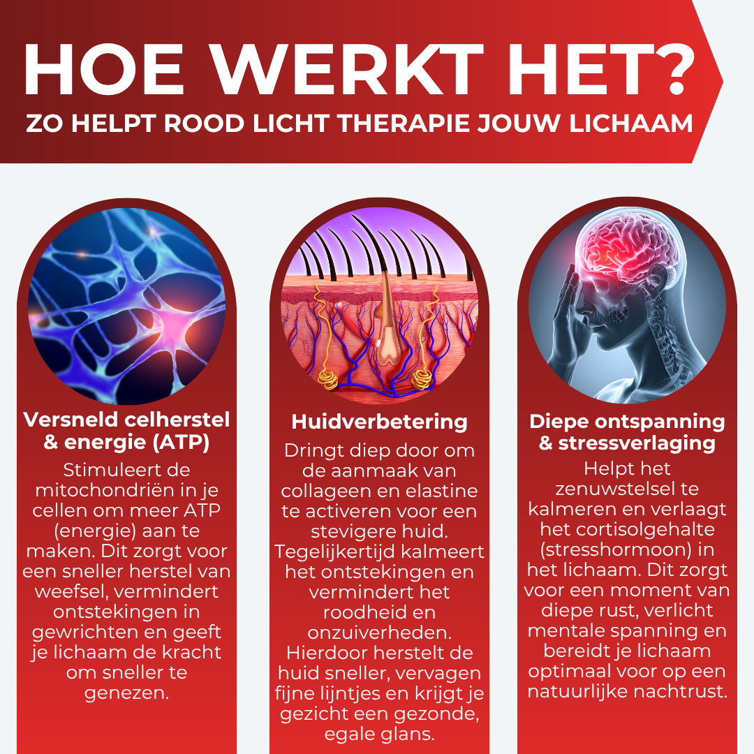 Rood Licht Therapie (RLT), ook wel Photobiomodulation (PBM) genoemd, is een niet-invasieve therapie waarbij de huid en het lichaam worden blootgesteld aan specifieke, natuurlijke golflengten van rood licht (rond 660 nm) en nabij-infrarood licht (rond 850 nm). Dit licht wordt geabsorbeerd door de cellen, wat de aanmaak van cellulaire energie (ATP) stimuleert voor herstel en regeneratie.