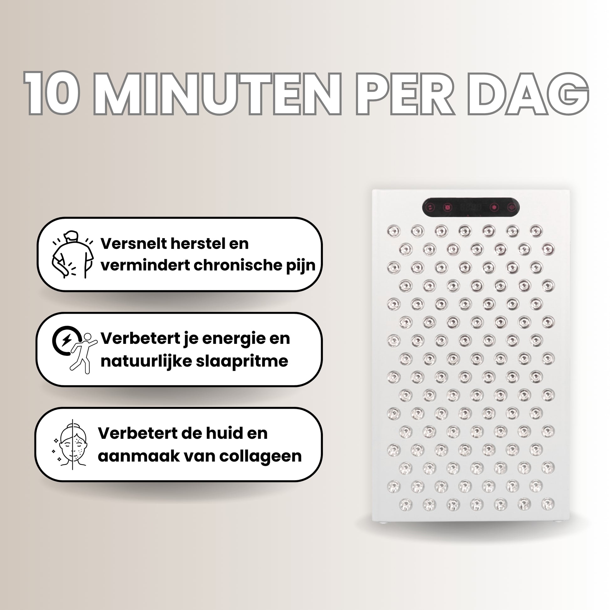Dit hangt af van het paneel en het doel. Voor huidverbetering zijn sessies van 5 tot 10 minuten (3 tot 7 keer per week) op een afstand van 15-30 cm gebruikelijk. Voor diep weefsel/spierherstel kunnen de sessies langer duren, maar de aanbevolen behandeltijd is doorgaans tussen de 10 en 15 minuten. Het LED Masker gebruik je 10 minuten per dag, 3 tot 7 keer per week.